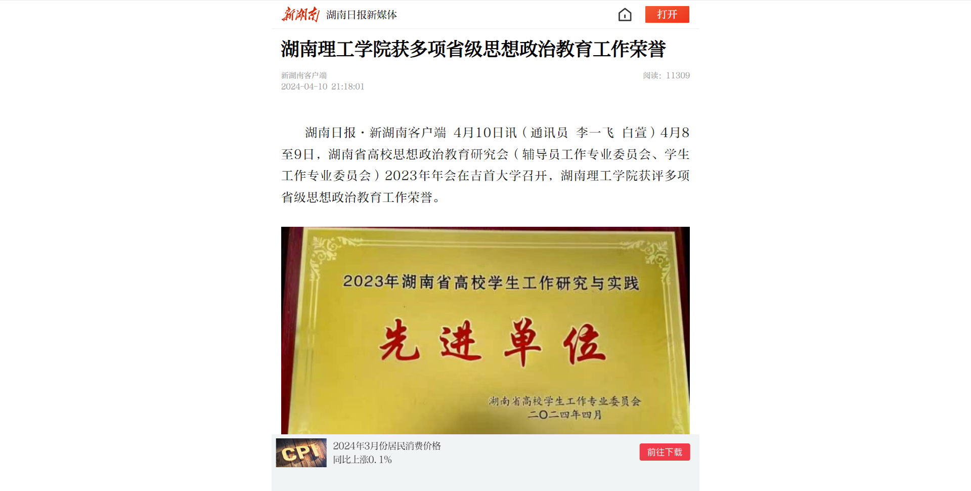 湖南理工学院获评“2023年湖南省高校学生工作研究与实践先进单位”;喻俊、单芳获评“2023年湖南省高校辅导员工作研究与实践先进个人”;李亦波、王旭智获评“2023年湖南省高校学生工作研究与实践先进个人”;余滔《“四个结合”推动“大思政课”高质量发展》论文获评“2023年湖南省高校辅导员优秀论文”;李罗娜《“五融”立体式新闻传播类大学生红色宣讲团进社区——以“声入人心、薪火相传”大学生宣讲团为例》工作案例获评“2023年湖南省高校学生思想政治教育优秀育人案例”。